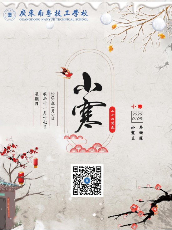 小寒至,冬渐深|愿你冷暖有知,岁岁安暖广东南粤技工学校广东南粤技工学校2026年1月5日 16:51广东今日我们迎来冬季的第五个节气小寒也标志着冬天最冷的时候要来了冬意正浓愿你日子滚烫岁岁安暖运营管理 | 学校新媒体中心海报设计| 陈怡瑜审核 | 王晓春投稿邮箱:3340826467@qq.com欢迎大家积极来稿图文©...